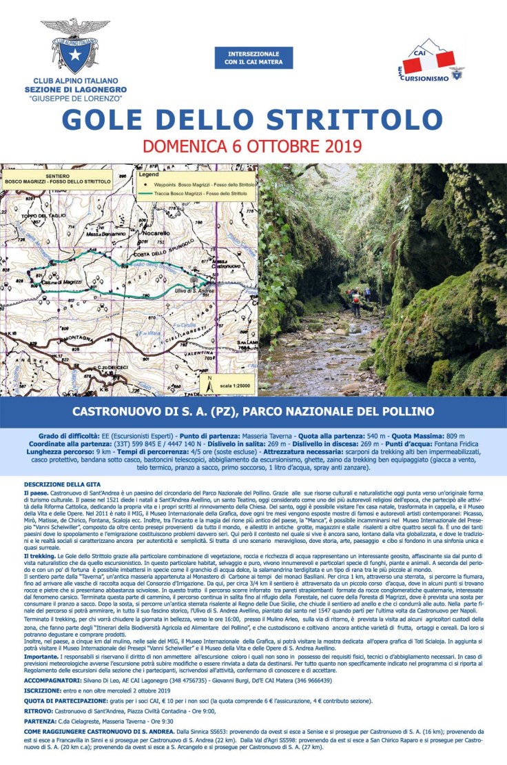 Il sentiero parte dalla “Taverna”, un’antica masseria appartenuta al Monastero di Carbone ai tempi dei monaci Basiliani. Per circa 1 km, attraverso una sterrata, si percorre la fiumara, fino ad arrivare alle vasche di raccolta acqua del Consorzio d’Irrigazione. Da qui, per circa 3/4 km il sentiero è attraversato da un piccolo corso d’acqua, dove in alcuni punti si trovano rocce e pietre che si presentano abbastanza scivolose. In questo tratto il percorso scorreinforrato tra pareti strapiombanti formate da rocce conglomeratiche quaternarie, interessate dal fenomeno carsico. Terminata questa parte di cammino, il percorso continua in salita fino al rifugio della Forestale, nel cuore della Foresta di Magrizzi, dove è prevista una sosta per consumare il pranzo a sacco. Dopo la sosta, si percorre un’antica sterrata risalente al Regno delle Due Sicilie, che chiude il sentiero ad anello e che ci condurrà alle auto. Nella parte finale del percorso si potrà ammirare, in tutto il suo fascino storico, l’Ulivo di S. Andrea Avellino, piantato dal santo nel 1547 quando partì per l’ultima volta da Castronuovo per Napoli.