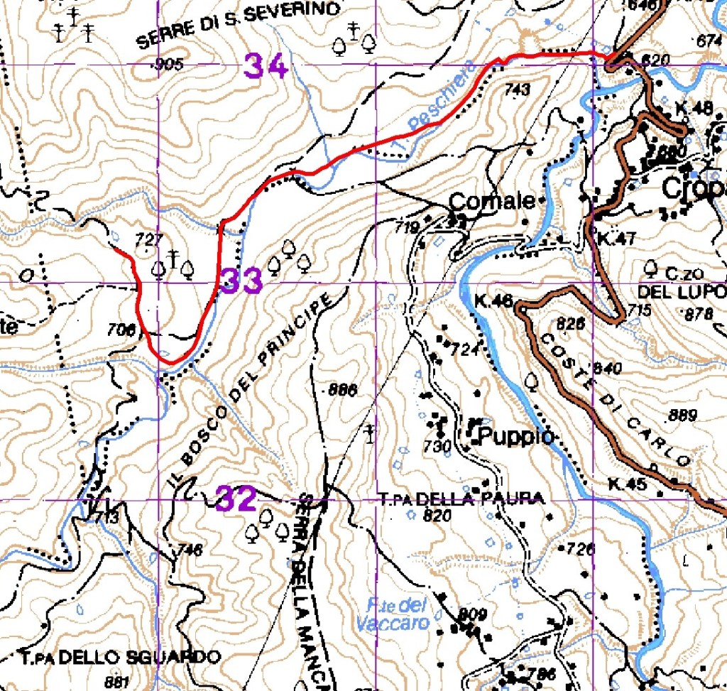Qui il sentiero si divide: a destra si inoltra tra banchi di gigantesche felci aquiline, ancora indicato come “sentiero Italia” con direzione Terme (km 17,350; ore 6); a sinistra si dirige invece verso l’abitato di Magnano (km 10,850; ore 3.30), attraversando il bosco e aggirando i recinti dell’area faunistica del capriolo (oggi area di ripopolamento del Cervo).