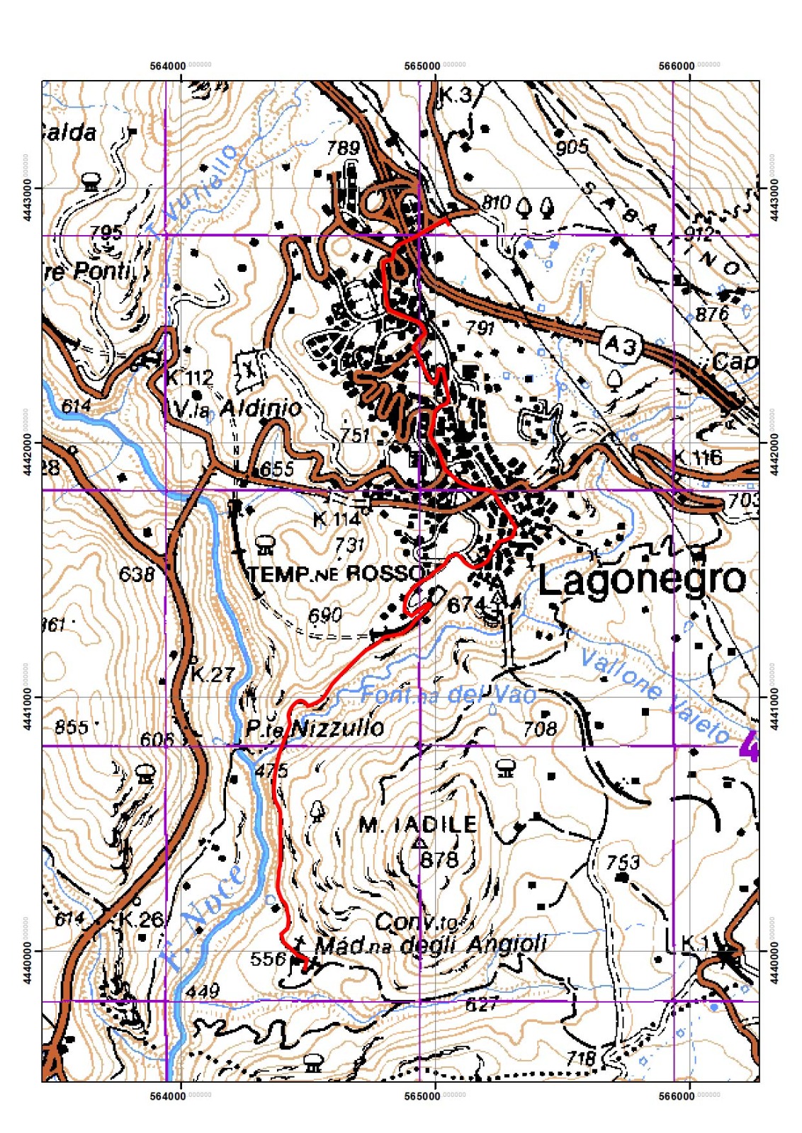 Località: Lagonegro (PZ), Gruppo montuoso: propaggini del Massiccio del Sirino – Lunghezza: 8,8 km a/r – Altitudine minima, altitudine massima: 804 m, 560 m – Dislivello in salita, dislivello in discesa: + 221 m, – 465 m – Durata: 3/4 ore, soste escluse – Grado di difficoltà: E – Punti d’acqua: diversi punti lungo il percorso – Attrezzatura necessaria: scarponi da trekking alti, bastoncini telescopici, abbigliamento da escursionismo adatto alla stagione, zaino da trekking ben equipaggiato (acqua, pranzo a sacco, abbigliamento di ricambio, giacca a vento, ecc.)