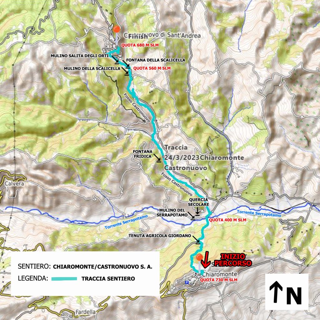 L’escursione inizia nel Centro Storico di Chiaromonte. Si parte da Piazza Garibaldi, a una quota di 730 m slm. Dopo un breve trekking urbano nella parte antica del paese si imbocca un antico sentiero, molto bello, con un dislivello tutto in discesa (-370 m) che conduce fino al Torrente Serrapotamo. Lungo questo tratto è consigliato l’uso dei bastoncini da trekking. Poco prima di arrivare alla fiumara, si farà una breve sosta nella tenuta agricola di Domenico Giordano, il quale ci parlerà della mission degli agricoltori custodi del territorio. Da qui, percorrendo un breve tratto di strada asfaltata, si raggiunge la fiumara del Serrapotamo (quota 400 m slm). Qui si trova una maestosa quercia secolare, inserita nell’elenco nazionale degli alberi padri, il cui tronco misura una circonferenza di oltre 7 m. Ai piedi di questo magnifico monumento naturale incontreremo il proprietario, Andrea Durante, un produttore di miele, il quale oltre a parlarci della sua esperienza di apicoltore ci farà anche degustare alcuni mieli pregiati di sua produzione. Poco distante dalla quercia si trova anche la struttura dove un tempo era impiantato uno dei più antichi e dei più produttivi mulini ad acqua del territorio, il Mulino del Serrapotamo. Dopo aver visitato la struttura dell’antico mulino, si ritorna indietro di tre/quattrocento metri, in direzione del “Fosso Castronuovo”. Si imbocca una comoda sterrata che percorre in falsopiano tutta la fiumara, con un dislivello in salita poco percepibile fino ai piedi dell’abitato di Castronuovo di Sant’Andrea (+ 160 m). Alla fine della sterrata si percorre un breve tratto di fiumara, e brevi tratti di strada asfaltata che dopo poche centinaia di metri riportano di nuovo sul sentiero. Sul tragitto che percorre la fiumara del “Fosso Castronuovo” si incontrano due fontane e i resti di altri due mulini ad acqua. Dopo aver visitato i resti dell’ultimo mulino ad acqua, completamente ricoperti dalla vegetazione, si percorre l’ultimo tratto di sentiero in salita, che porta in paese, in Piazza Civiltà Contadina, il punto di arrivo dell’escursione.
