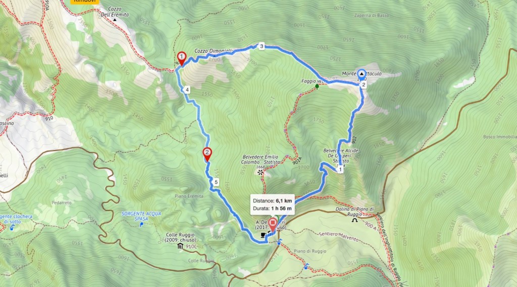Si prosegue senza sentiero apparente nel bosco, fino a Cozzo Dimoniello. Altro punto panoramico. Da qui si incrocia un sentiero sempre nel bosco che ci riporterà a rifugio De Gasperi.
