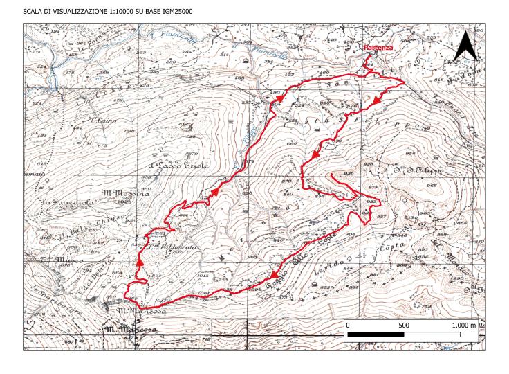 Partenza da fiumicello di Lauria (possibilità di rifornimento d’acqua), si prosegue per il sito di interesse culturale “coro dei monaci” facente parte del complesso dell’abbazia di san Filippo (X sec), ci si inoltra poi nel bosco per un comodo sentiero, passando per località “arioso” (antico insediamento abitativo, completamente abbandonato della quale restano pochi ruderi), fino a punto panoramico sulla valle del noce, da qui si prosegue in cresta fino alla cima ( vista sulla foce del noce e tutta la costa circostante), proseguendo in discesa sempre su cresta panoramica fino a località “Fabbricato”, dove si rientra su tratto di strada asfaltata passando per i ruderi della suddetta abbazia.
