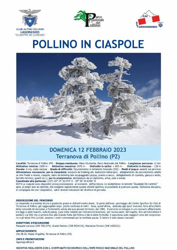 Località, gruppo montuoso: Conserva di Lauria, Parco Nazionaledell’Appennino Lucano Val D’Agri - LagonegreseLunghezza: 5.2 kmAltitudine minima, altitudine massima: 1408 m, 1715 mDislivello in salita, dislivello in discesa: +326m, -18mDurata: 4 ore, soste escluseGrado di difficoltà: EAI (Escursionismo in Ambiente Innevato)Punti d'acqua: Assenti sul percorsoAttrezzatura necessaria:scarponi da trekking alti, bastoncini telescopici, abbigliamento daescursionismo adatto ai climi... Continua a leggere →